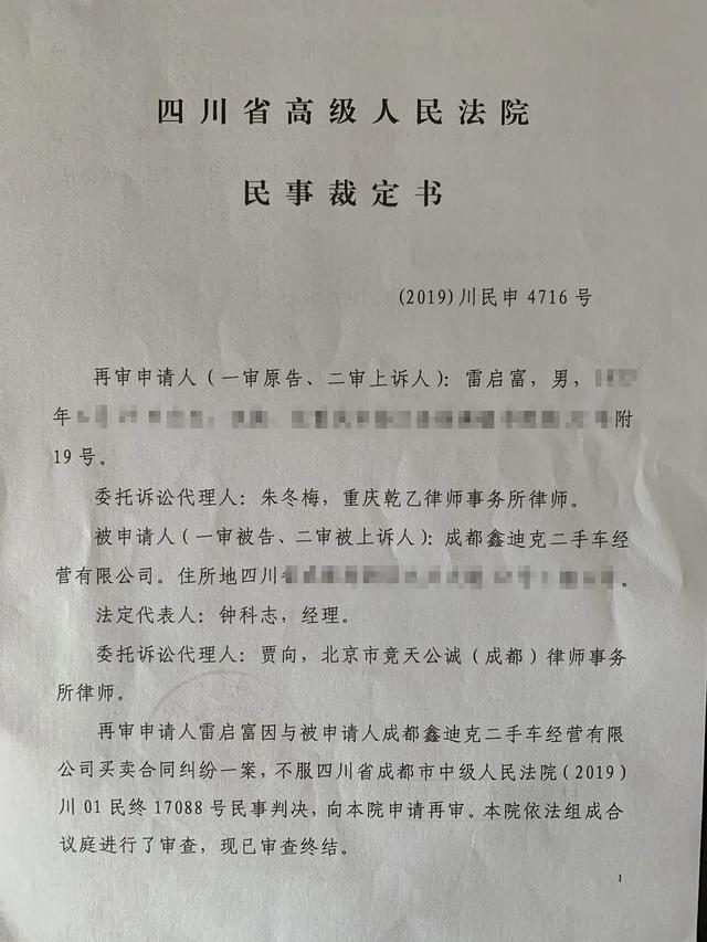 歷時(shí)十個(gè)月的等待,買(mǎi)到事故車維權(quán)接連敗訴的重慶律師雷啟富,終于收獲好消息。他6月6日告訴澎湃新聞,去年8月提出再審申請(qǐng)后,四川省高院日前作出裁定,決定提審該案進(jìn)行再審。