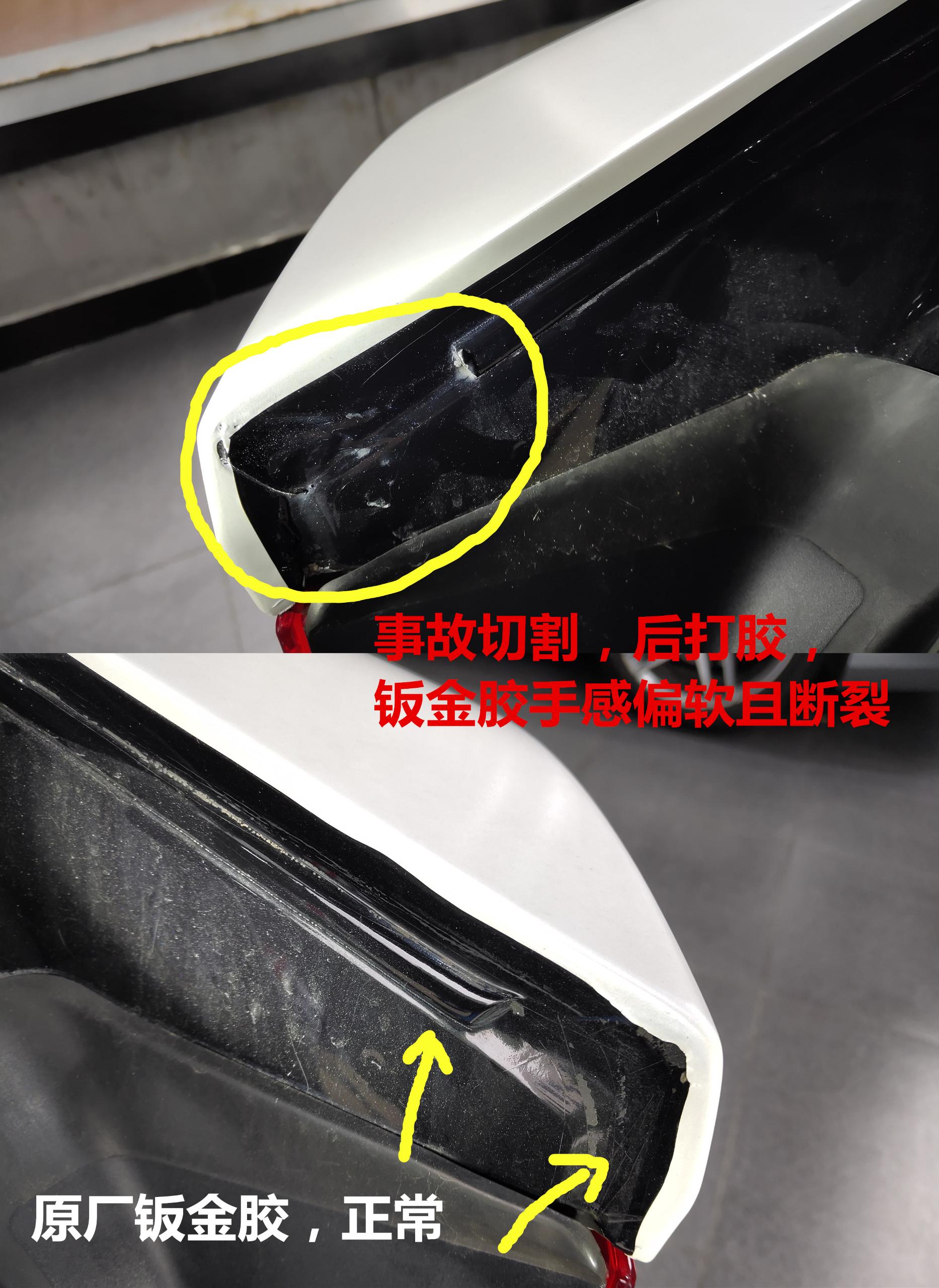 總體來說這車維修工藝還是比較好,但是魔高一尺道高一丈,畢竟再怎么掩飾它終究還是維修過,痕跡多少會(huì)異于原車,這需要你豐富 看車經(jīng)驗(yàn)就可以查出蛛絲馬跡,并且由于時(shí)間較長(zhǎng),左后水槽處的底部一段膠已經(jīng)脫落了,和右側(cè)的導(dǎo)水槽膠對(duì)比,明顯少了一小截……