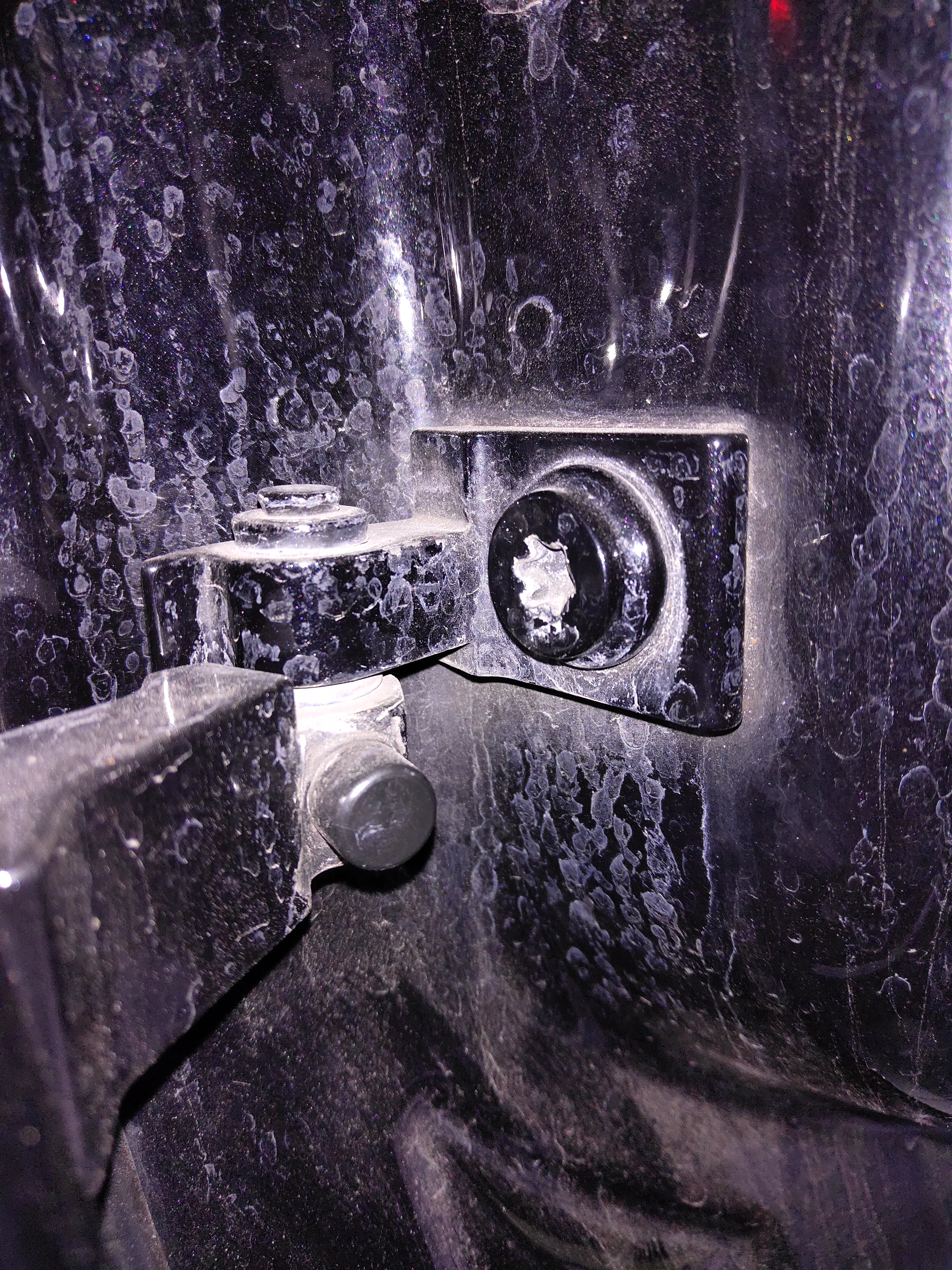 事故導(dǎo)致左后門及左后葉損傷嚴(yán)重,可以推測(cè)當(dāng)時(shí)的碰撞力度不輕,所以左后門已經(jīng)重新更換了??梢钥吹阶蠛箝T鉸鏈固定螺絲有拆卸痕跡(發(fā)白掉漆)。